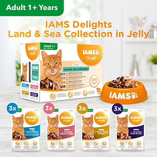 IAMS Delights Complete Wet Cat Food for Adult 1+ Cats Meat and Fish Variety in Jelly Multipack 12 x 85 g Pouches
